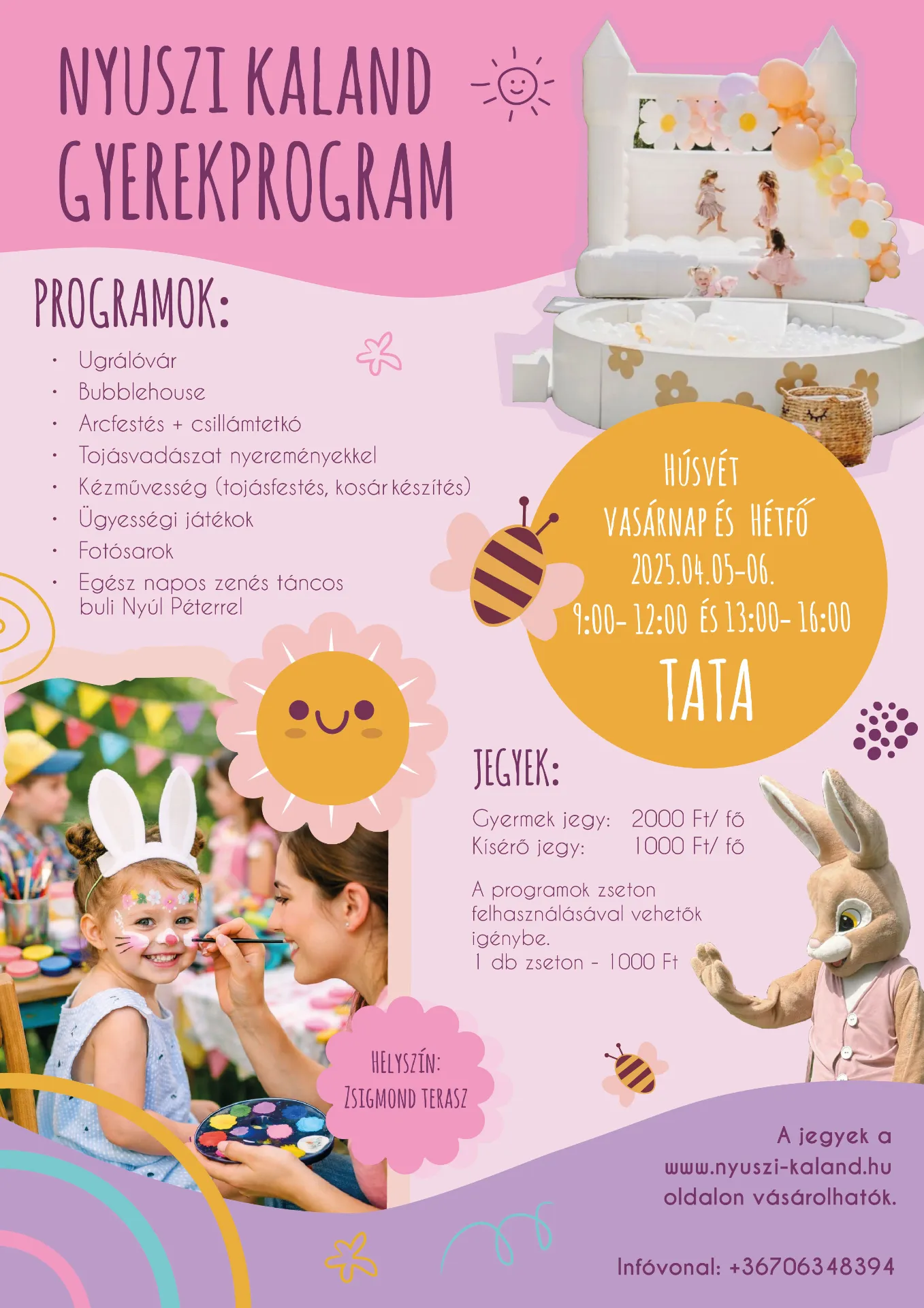 Izgalmas tojáskeresés, nem mindennapi workshopok, látványos húsvéti dekoráció és egész napos gyerekprogramok teszik felejthetetlenné ezt a napot. Lesz ugrálóvár, arcfestés, kreatív alkotás és rengeteg meglepetés — mindez egy varázslatos, tavaszi díszletbe öltöztetett helyszínen. Ha szeretnétek egy igazán élménydús, tartalmas családi napot, a Nyuszi Kalandon a helyetek!